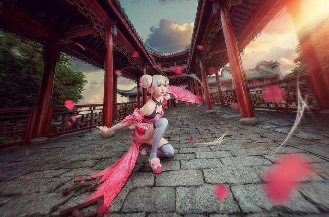 接下来再看看灵动的小乔~先给这个后期点个赞,背景图超美,超有感觉。小乔扇子一出,落英缤纷,画面中透露出一丝丝杀气~