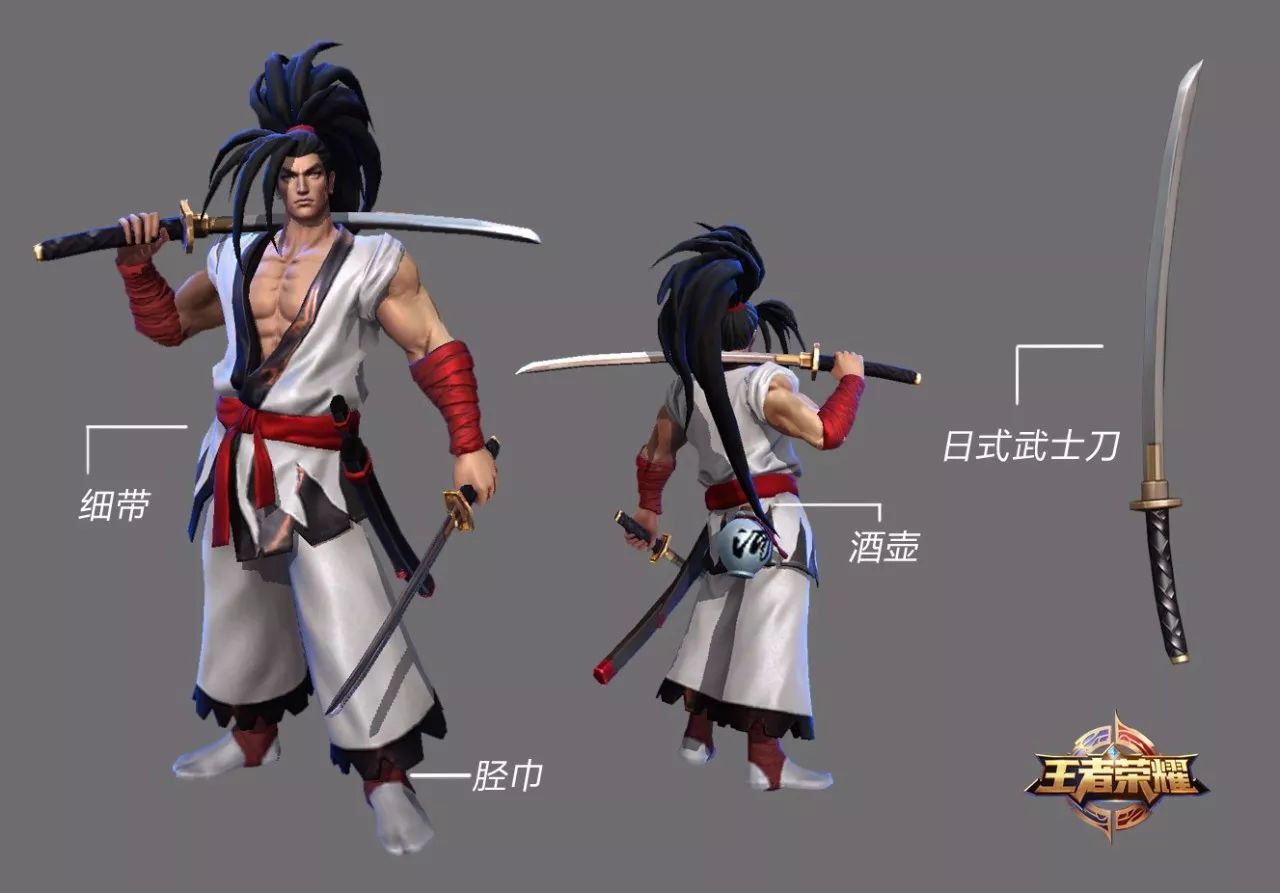 在设计上还原了原作上的形象。作为日本武士身着长衫、细带、胫巾。再加上酒壶和夸张的发型,嚣张的眼神,一个江湖浪客的形象栩栩如生。