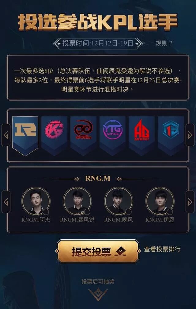 一次最多选 6位 (总决赛队伍、 AS仙阁.辰鬼 受邀为解说不参选),每队最多 2位 ,最终得票 前6 的 职业选手 将联手明星在 12月23日总决赛-明星赛 环节进行混搭对决。