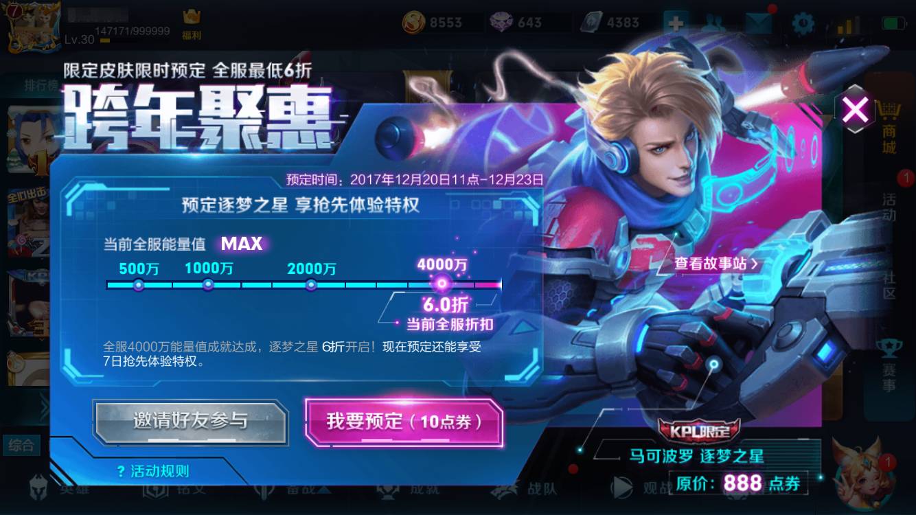 随着KPL秋季赛总决赛的临近, 昨天11点 KPL限定皮肤- 逐梦之星预定活动 正式开始!能量值于当天12:20轻松突破4000万,并于14:06达到MAX!