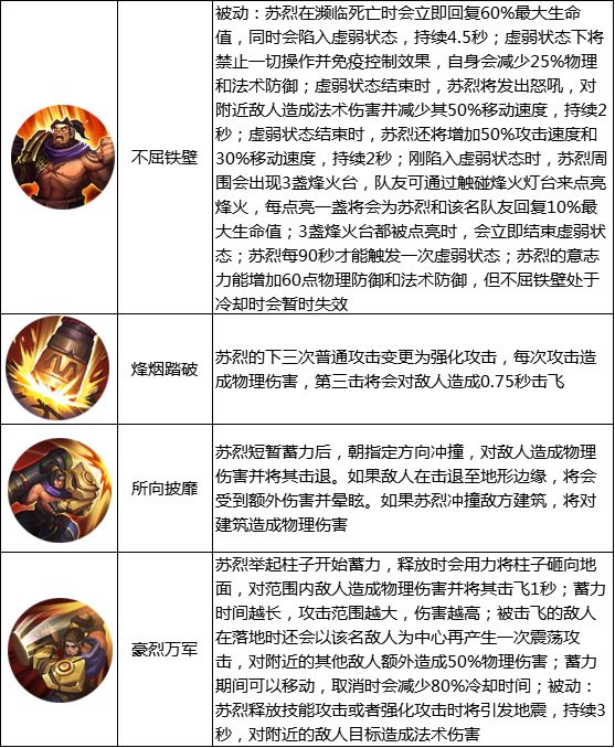 苏烈作为坦克中的佼佼者,由于被动的存在坦度十足,很难被对面击杀。中前期可以大胆去卖,给打野gank创造好机会,而发育成形的大叔,在团战中更能打出不俗的控制与伤害!喜欢暴力的召唤师不要错过了哟~