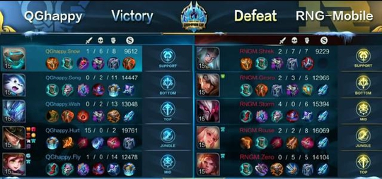 最后1局是QGhappy对战RNGM,QGhappy的位置大变,飞牛用孙膑来打中路,而伪装变成了边路,不得不说飞牛的中单也不是假的,和暴风锐打得棋逢对手,双方前期僵持。18分钟的一场团战,QGhappy配合完美,盾山大招封路,刺痛马可打出惊天输出拿下三连决胜,让QGhappy有一定优势。