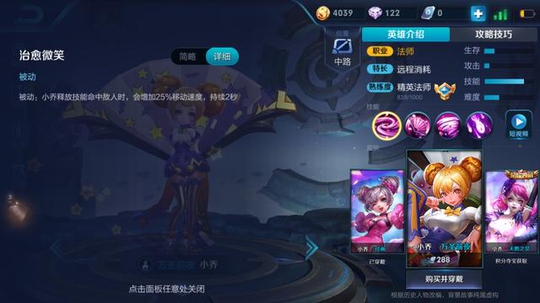 被动-治愈微笑:被动能够为小乔提供移动速度加成,这对于没有位移的小乔来说非常重要,加速效果不仅可以使小乔的走位更加灵活,也可以增加小乔的生存能力,在对线时小乔每释放一次技能消耗对手,都可以利用被动的加速效果,防止被对方技能命中消耗。