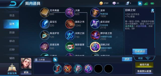 买完过渡装接着买回响之杖,提高法强和移速,游走能力非常强,再把光辉之剑合成巫术法杖,这个时候是杨玉环最强的时候,多配合队友报团拿优势。