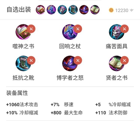 出装方面推荐:噬神之书+回响之杖+痛苦面具+抵抗之靴+博学者之怒+贤者之书