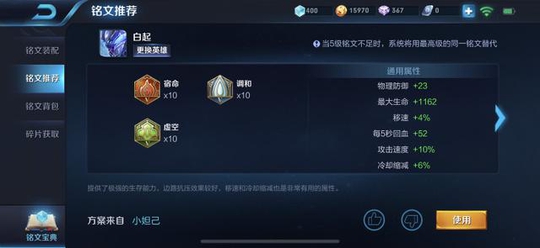 铭文这方面主要是以肉为主,其实太多的护甲和魔抗铭文并不能让白起在前期变的更肉,其实铭文最肉的还是血量,前期多1000的血量就算敌人的伤害在高也高不到哪里去,因为他技能的伤害和平A伤害是固定的,你血多,他基本拿你没有什么办法,至于后面的攻速主要是在对线上清兵能更快,CD则是减少白起的大招时间,白起的大招才是这个英雄最厉害的地方。