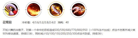 解析:不知火舞朝指定方向扔出扇子,对命中的目标造成伤害和减速同时减少其法抗3秒