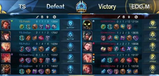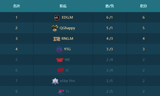 第5局是TS对战EDGM,EDGM一开局就打得很凶,入侵野区强行反红,之后慢慢把握了比赛的节奏,12分钟,太乙加杨玉环的双控直接带走TS的李信和关羽,EDGM直接破掉TS下路高地,接着双方进行了长时间的拉锯战,但EDGM的复活甲很多,让他们在最后一波团战中战胜对手,6胜1负完成第一阶段比赛,目前是第1名。而TS则已经被淘汰、