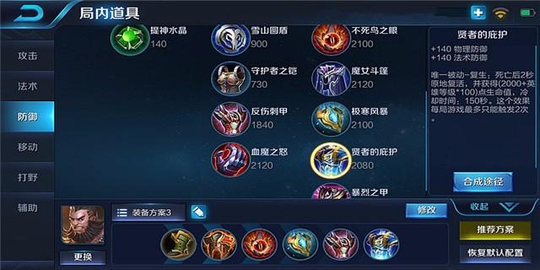 6.贤者的庇护:死亡后2秒原地复活,并获得一定生命值,冷却时间:150秒。这个效果每局游戏最多只能触发2次。保证了程咬金大招没开被集火秒杀后能迅速站起来继续团战,大后期可以换成血魔之怒。