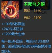 我们要说的就是吸血流的庄周,所以不死鸟之眼加强庄周回血的效果,也能增强庄周的法术防御。还能够提升庄周的最大生命值。