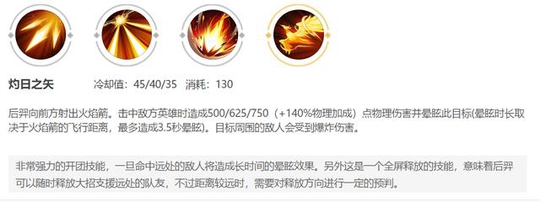 大招解析:后羿或者艾琳射出一个能够穿越全图的火焰箭,命中敌方英雄时造成500/625/750的伤害,这个伤害还有140%的物理加成,同时可以使敌方眩晕在原地,最多长达3.5秒。