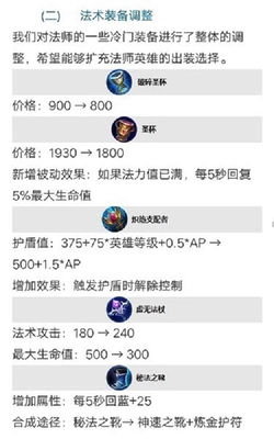 小圣杯,属性不变,价格降低了100,800就能买了,大圣杯价格整体降低了130,新增被动效果,如果法力值已经满了,每5秒就会回复5%的最大生命值,圣杯轻松满蓝,掉的血加上去也是分分钟。