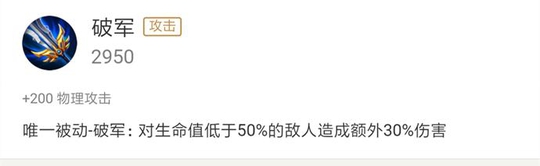 面对敌方肉盾型的前排英雄,娜可露露一套技能往往只能将其打成半血,破军做出来就不同了,破军对于生命值低于50%的目标可是额外增加30%的伤害,就算是前排肉盾也扛不住。