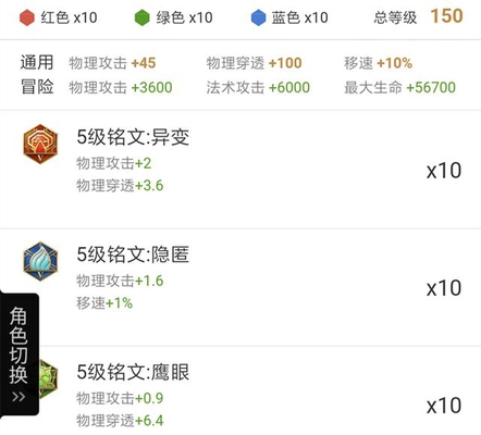 铭文总属性:物理攻击+45,物理穿透+100.,移速+10%