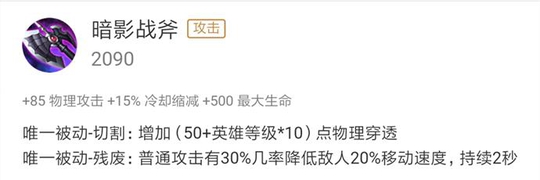 暗影战斧是娜可露露前期必不可少的一件神装,可以说不做暗影战斧的娜可露露是没有灵魂的,这件装备做出来,不仅让娜可露露具备了秒脆皮的能力,而且其 15%的CD 缩减 ,配合娜可露露CD时间很短的大招,可以让娜可露露快速的将节奏带起来。