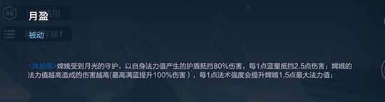 自身法力值会替你承受80%的伤害,一点法力值抵挡2.5点伤害,法力值越高伤害加成越高,一点法术强度增加嫦娥1.5法力值、