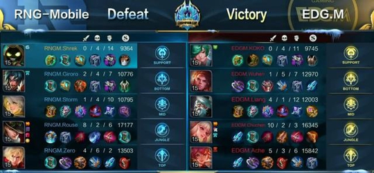 第4局,一开局EDGM就打得比较凶,尤其是浪浪的张良,几次和队友gank拿下对手的人头,他们也强势把握了比赛节奏,RNGM只能是猥琐防守,想拖到孙尚香彻底发育起来再打,EDGM则寻找所有磨塔的机会,并在20分钟磨掉RNGM所有高地塔。