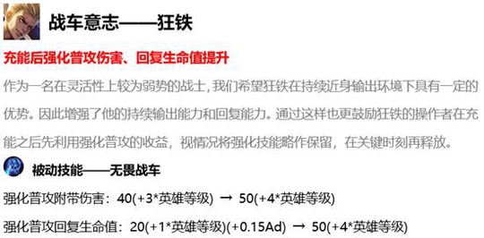 是的,没错,狂铁这次真的要成边路强势之手了,主要变动的是被动,狂铁现在被动伤害提升了10点,还有回血比例的话直接提升了30点,不过是需要在四级之后的,前期就没有那么高的比例,但是在四级之后,狂铁的作用能力就会变得更高了,可以针对很多强势的边路英雄,比如花木兰达摩这些,狂铁现在跟他们换血,自己会赚很多的。