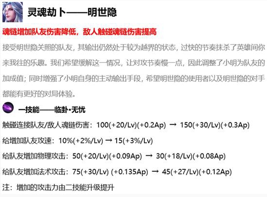 小明的这次变动,其实是取长补短,增加了连接队友的时候的伤害,而给队友增加的物理还有法术攻击的话都变少了一些,但是这算是变得不厉害把,不过现在也是因为小明长期被送上ban位的原因,所以我相信平衡嘛,也是要想办法把小明给放出来的,一个英雄一直处于ban位也是不好的现象,今天的新版本更新就更新了这几个英雄,这些英雄的变动,现在已经是更新在正式服的了,一些解析也希望大家能理解,也希望大家能跟着版本上分。