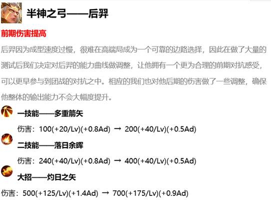 现在对线到后羿的边路,要小心了,后羿的整体伤害都提升了,特别是在前期,现在后羿能消耗到谁,那么他就会更痛苦,三个技能的伤害都提升了不少,不过最重要的还是一技能,一技能就是后羿的核心技能,该技能持续的效果是五秒,五秒内,一技能打出的普攻伤害是足够秒人的,前期战士也不在话下,不过一般碰到会玩的,没有到四级的战士,肯定不会跟后羿抗衡了,后羿要是出几个夺萃铭文,跟对面的边路换血,直接压着对面的兵线打了。