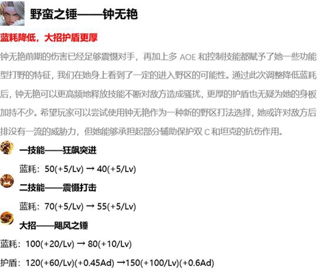 钟无艳的变动一二技能的主要点是减少了蓝耗,其实钟无艳在这个版本也算是很强势的边路英雄,只不过用得召唤师太少,所以这次的变动呢,也算是钟无艳分到了一杯羹,大招的护盾,现在也多加了30点,相信也会强势起来的,钟无艳也有秒人能力,主要是能把技能命中到敌人身上,钟无艳的发挥就会更完美了。