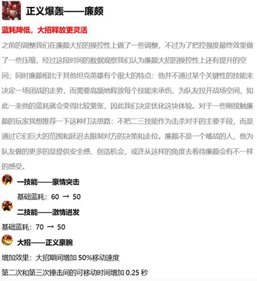 廉颇也是版本变化比较大的英雄,上次的变动之后,廉颇的作用确实是高了不少的,而这次的变化,再次给廉颇降低了门槛,现在的廉颇也会更强势,大招可以移动的时候多加了0.25秒,还会增加50%的移动速度,现在先手开团的廉颇会更强势了,反手保护能力也比较好,而且一二技能的蓝耗也都降低了,相信廉颇这次改变之后,会更猛了。