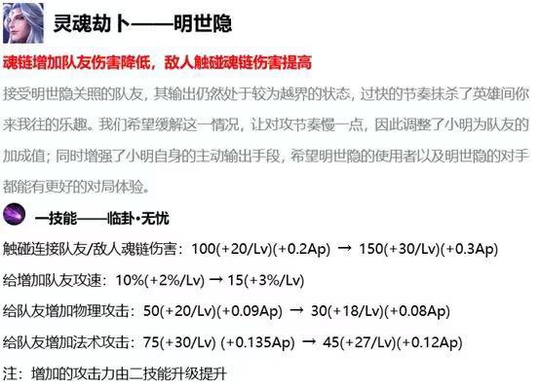 解析 :提高魂链伤害,加攻速,减少属性加成。完全可以理解为,减少的是爆发伤害,提高的是持续输出伤害。意味着这一次更改,让小明去链接射手更为合适,这攻速提升的非常多。低端局很多人不会对这个英雄进行反制,所以还是不推荐将他放出小黑屋,这点削弱不影响他的地位。