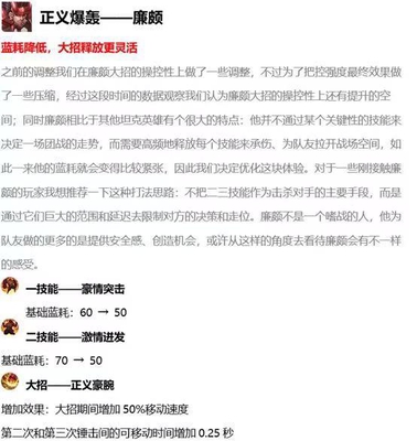 解析 :减少蓝耗,提高了灵活性。廉颇一直以来给人笨重的感觉,这次大招又提升了移动的时间,可以让廉颇在团战中更好的去切割战场,限制敌方的走位,虽然不属于大提升,但是喜欢玩辅助的可以试一下。