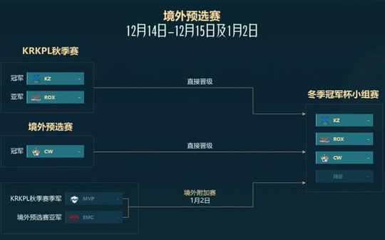 其次,在韩国KPL赛区中,KZ与ROX这两支秋季赛的冠亚军队伍也是直接可以进入到KPL冬季冠军杯的小组赛中。然后,境外预选赛冠军CW战队也是直接晋级。而最后一个名额则是要从韩国KPL秋季赛季军MVP战队与境外预选赛亚军EMC战队之间产生。