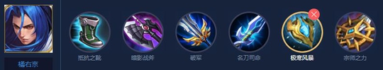 暗影战斧+破军,这两件是橘子不可少的装备,有了这两件装别,橘子的伤害会提升一个阶段,而名刀也是为了补橘子的容错率的,橘子的身板比较脆,被接近会比较难受,而宗师这件装备主要是用来强化橘子的普攻伤害的,后期名刀可以互换复活甲。