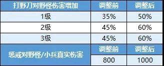 野怪血量增加20%,打野刀的伤害增加15%。可以说打野的前期打野速度会变慢,随着对局的进行和装备的更新,打野速度会慢慢加快(总而言之打野的刷野速度会以一个平滑的上升曲线来形容)