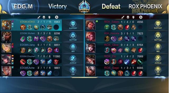 EDG.M蓝色方 ROX红色方EDG.M禁用: 李信,盾山,杨玉环,孙膑。