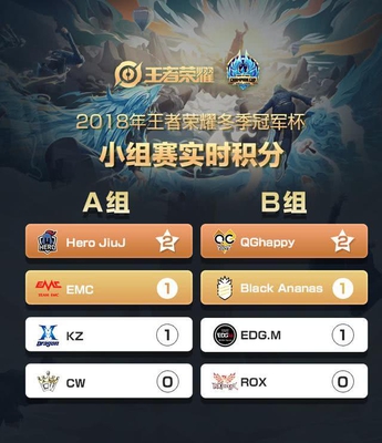 1月4日15:00,2018年冬季冠军杯小组赛热血开赛。四支KPL队伍与四支境外队伍根据抽签分为两个小组,A组:CW 、EMC、Hero久竞、KZ;B组:BA黑凤梨、EDG.M、QGhappy、ROX。组内双循环BO1赛制,没有练兵只有胜利,场场都是"巅峰对决"!