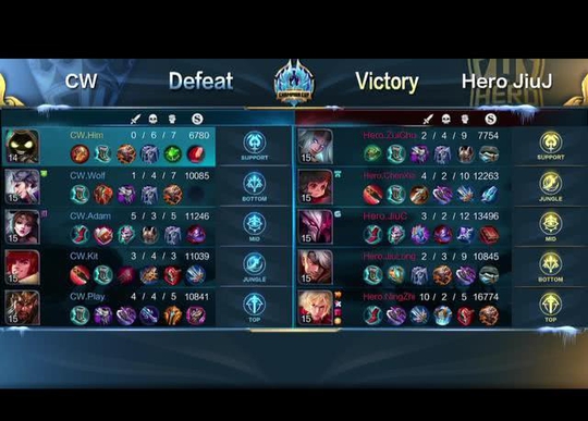 开局Hero李元芳配合队友反掉CW的蓝BUFF并拿到一血。前期Hero持续进攻CW蓝BUFF,CW貂蝉无蓝BUFF可用。9分钟,CW关羽绕后单抓Hero李元芳失败被反杀。10分钟,Hero拿下黑暗暴君,击杀CW太乙真人。11分钟,Hero下路三人围攻刘邦并击杀。12分钟,Hero进攻CW中路高地被CW关羽绕后包抄,Hero核心干将莫邪被击杀,Hero正面溃败,CW劣势得到缓解。13分钟Hero拿下主宰。14分钟中路,Hero东皇太一再次被CW关羽包抄,Hero队友前去支援被CW正面击溃。18分钟,抓住CW复活时间不一致的弱点,一波团战将CW团灭,击破水晶取得胜利。