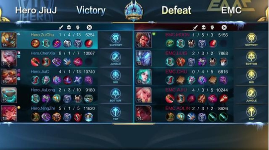 双方平稳开局,2分钟Hero鬼谷子击杀EMC张飞拿下一血,Hero百里首约击杀EMC王昭君。3分30秒,EMC完美配合将Hero鬼谷子击杀。5分钟,中路团战EMC公孙离拿下双杀。8分钟中路团战,Hero打出零换三。10分钟EMC公孙离上路单杀Hero百里守约。11分钟,Hero团灭EMC,Hero众人准备进攻EMC水晶被刚刚复活的吕布阻挠,EMC吕布拿下双杀,Hero撤退。14分钟,EMC下路二塔,Hero打出零换四,EMC仅剩王昭君无力防守,Hero击破水晶拿下比赛!