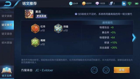 在铭文的选择上我推荐大家出狩猎红月以及鹰眼。因为黄忠的被动提供不错的物理攻击跟暴击率因此首先追求的肯定是攻击速度,因此狩猎跟红月就成了不二之选。加上还有一定的移送速度加上一技能的加速让黄忠可以更好的走A。至于鹰眼,应该是所有射手的标准配置。