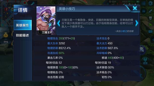 而破除隐身后攻速就已经达到了60%,也就是说增加了额外50%的攻速,这也是兰陵王一级就很强势的英雄一级就拥有二个技能,而且有60%攻速的效果。