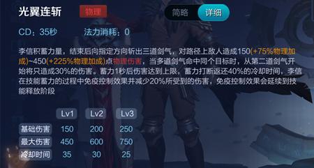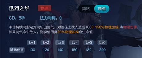 二技能是李信的主要伤害技能,持续向指定方向斩出最多四道剑气,命中敌人还可以回复血量。