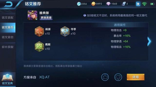 在铭文的选择上我推荐大家出祸源夺萃以及鹰眼。这一套铭文提供了不错的吸血效果以及暴击率。祸源搭配上无尽以及宗师可以让雅典娜有不错的暴击率,基本可以二个技能加普攻直接带走脆皮。至于夺萃就提供不错的物理吸血效果让雅典娜清理野区的时候没有太多的消耗,不至于耽误自己gank的时机。