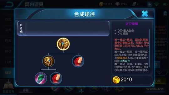 近卫荣耀: 常见的辅助装备,是抱团利器。但是在日常的排位中一般都是先出一个学时宝石,游走混钱,然后补一个靴子,最后才出这个大件。这样不仅可以保证射手或者打野前期的发育,还可以再出完鞋子之后,更加快速的支援游走。而大件近卫荣耀的被动可以说是抱团型辅助的神器,不仅可以提供一定经济还可以提供友方物理伤害和法术伤害加成。满级之后可以提供:75点物理伤害和150点法术伤害,相当于己方所有队员额外多了一个大件了,其效果可想而知。