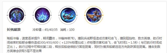 技能解析:孙策的大招是一个十分强力的支援技能,让孙策能够更加快速的支援队友,帮助队友更好的赢下团战。在开启大招的时候,孙策会获得霸体效果,同时开启7秒钟的冲刺效果,在撞到墙壁、敌方英雄或其他障碍物之后,孙策会跳下船,同时对敌方造成击飞效果。在航行的过程中,孙策也能够主动结束大招,从而让船自行撞向敌人,在自行跳船之后让船撞到敌方英雄之后,孙策会活动5层的不屈效果,从而短时间的提升孙策的护甲值。