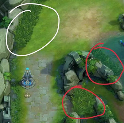 注意这三个草丛,红色草丛用于确定敌方动向,比如敌方是否来反蓝等,没有位移时推荐蹲在下方的红色草丛。当我们开局后判断很容易被敌方射手辅助压制或已经被敌方压制时,我们可以在敌方丢失视野的情况下直接进入白色草丛,来吃取兵线的经济经验,直到兵线进塔再开始清兵。