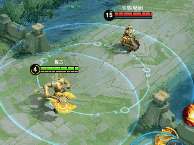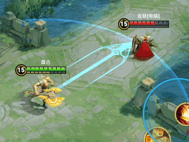 盘古朝指定位置跳跃,落地时对内圈的敌人造成伤害,如果落地时内圈没有敌人盘古会获得50%的加速效果持续3秒。如果落地时外圈有敌方英雄,盘古会立即冲向敌人,如果在冲刺路径上遇到敌方英雄会将敌人击退并造成伤害同时自己停下。在持斧状态下敌人会被击退更远的距离并且会对击退路径上的其他敌方单位造成伤害。