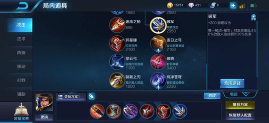追击刀锋和攻速鞋配合召唤技能惩戒可以让刘备前期快速的在野区发育,提高经济。黑切可以减少技能CD,血刀可以增加持续输出能力,碎星锤的被动有物理穿刺效果,让伤害更加爆棚。破军可以更具实际情况出,如果是逆风局可以考虑换成复活甲。