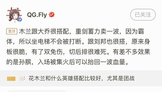 关于花木兰这个英雄的搭配套路,QGhppy.Fly向广大召唤推荐了几个双排好搭档,木兰+大乔;木兰+刘邦;木兰+孙膑;突然小妹感觉自己上分有望了,小妹平常就爱玩这些保护欲超强的英雄,来个木兰大神带我飞?