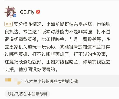 木兰上分敌手是谁?东皇,张良,程咬金,芈月,曹操等等!似乎在Fly眼中这个版本的木兰还是很弱啊!Fly表示:扬长避短就好,抓住对手弱点一样可以带飞队友!小妹再次恳请木兰大神带飞!