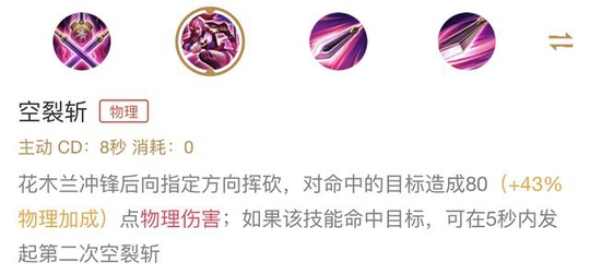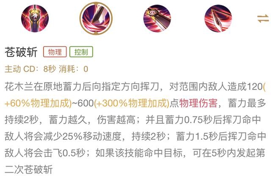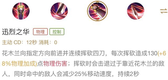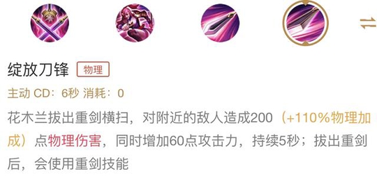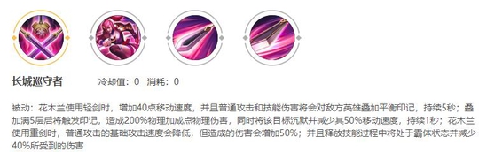 依靠这个被动,花木兰在重剑形态下,可以不用出太多的防御装备,也有不错的坦度,而双剑形态的5次伤害可以沉默英雄并且减速,如果触发,可以很好的防止敌人在木兰使用技能combo的时候逃脱。