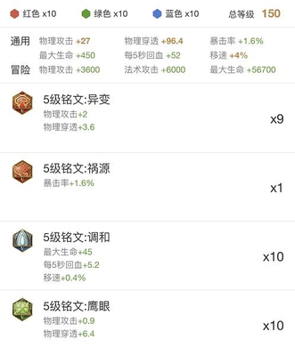 上面我们说到花木兰的初始血量只有2886,所以10个调和不管是血量的加成还是每5秒回血的加成都可以帮助木兰在对线期间减少点对手所带来的压力,不至于被敌人随便消耗一下就要回城,因为花木兰的伤害来源绝大部分是来自技能,而鹰眼和异变所带来攻击力加成和护甲穿透效果对木兰来说都是巨大的,所以绿色鹰眼和红色异变是木兰最合适的。而带一个祸源的目的,是为了在我们在进行技能COMBO时中间穿插的平A可以触发幸运暴击,(完全看脸,可以选择带10异变,也可以选择带一个祸源来拼运气)
