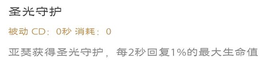 被动技能保证了亚瑟基本的续航能力,并且本身并无蓝耗的需要,可以减少回城的次数。不过在现版本的节奏来说每2秒1%的回复量的确有点力不从心。