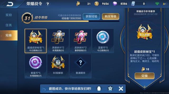 同时今天在体验服中加入了新的等级系统:荣耀战令,升到相应等级有英雄,皮肤,碎片排位保护卡等奖励!战令还可以自行兑换欧